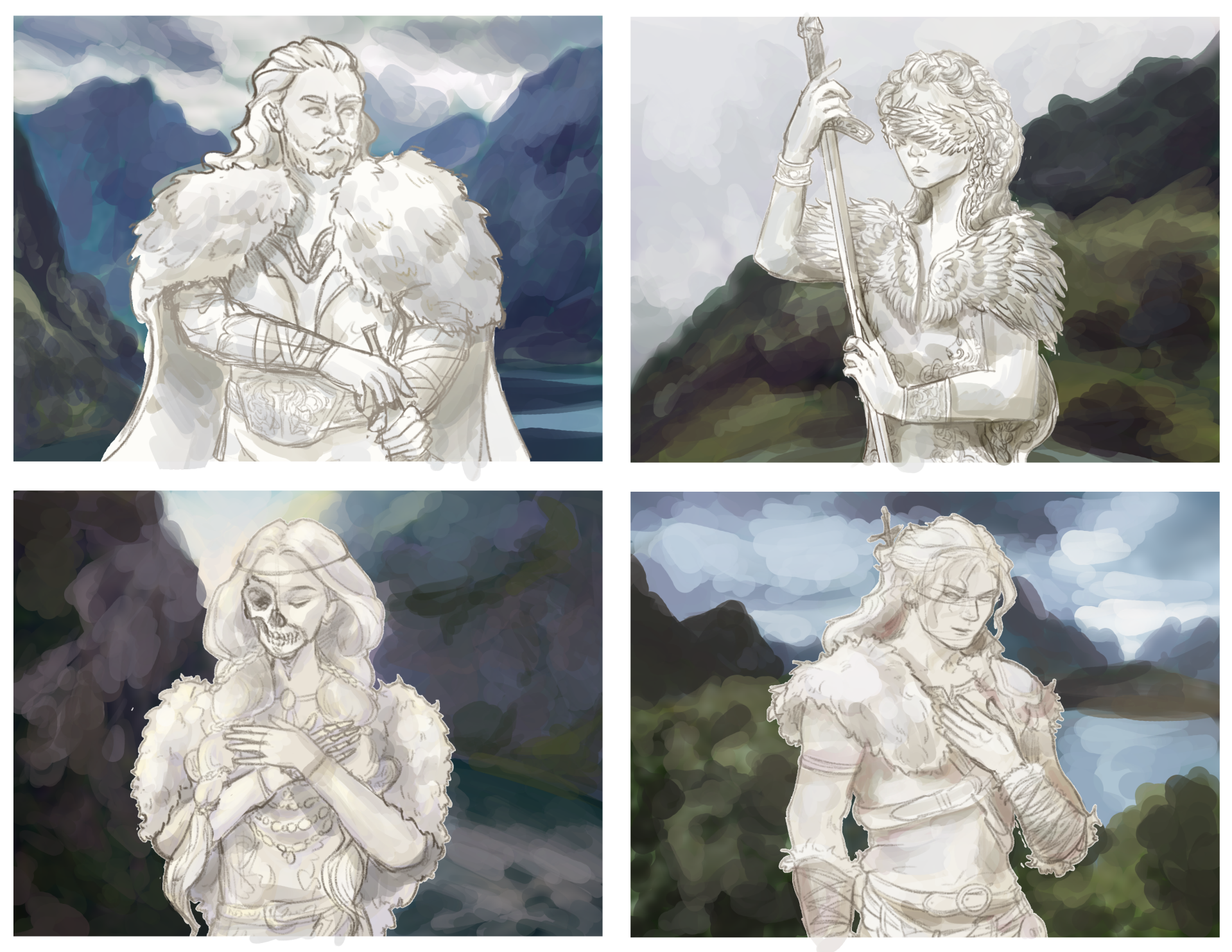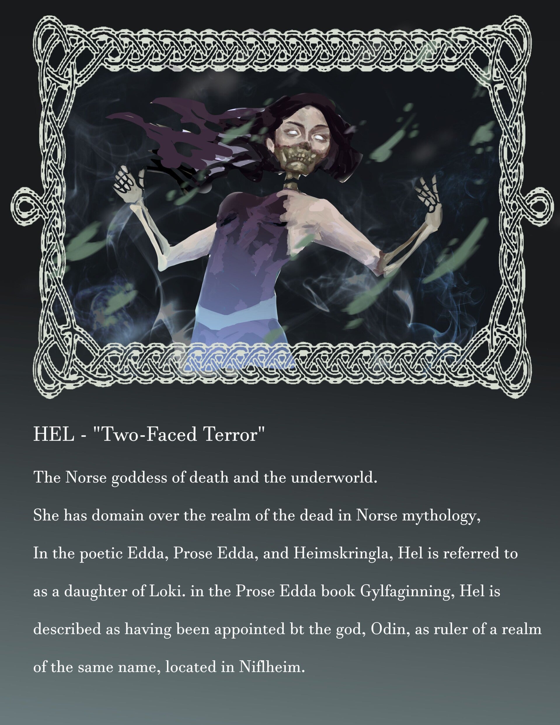 These are the official illustrations used for the cards. All the gods are depicted in black and white to indicate that they are just statues. This was intended to remind players that offering an item to a specific shrine would grant a wish from that God. As you only see them from the waist up, I thought it was important to embody their personalities through their poses. Freyja treats her sword like a close friend, Heimdall is reaching for his horn as he is ready for foreseeable danger, Hel has her hands on her chest to show compassion and sincerity, and Loki has his hand over his heart like making a promise, but with a mischievous grin.