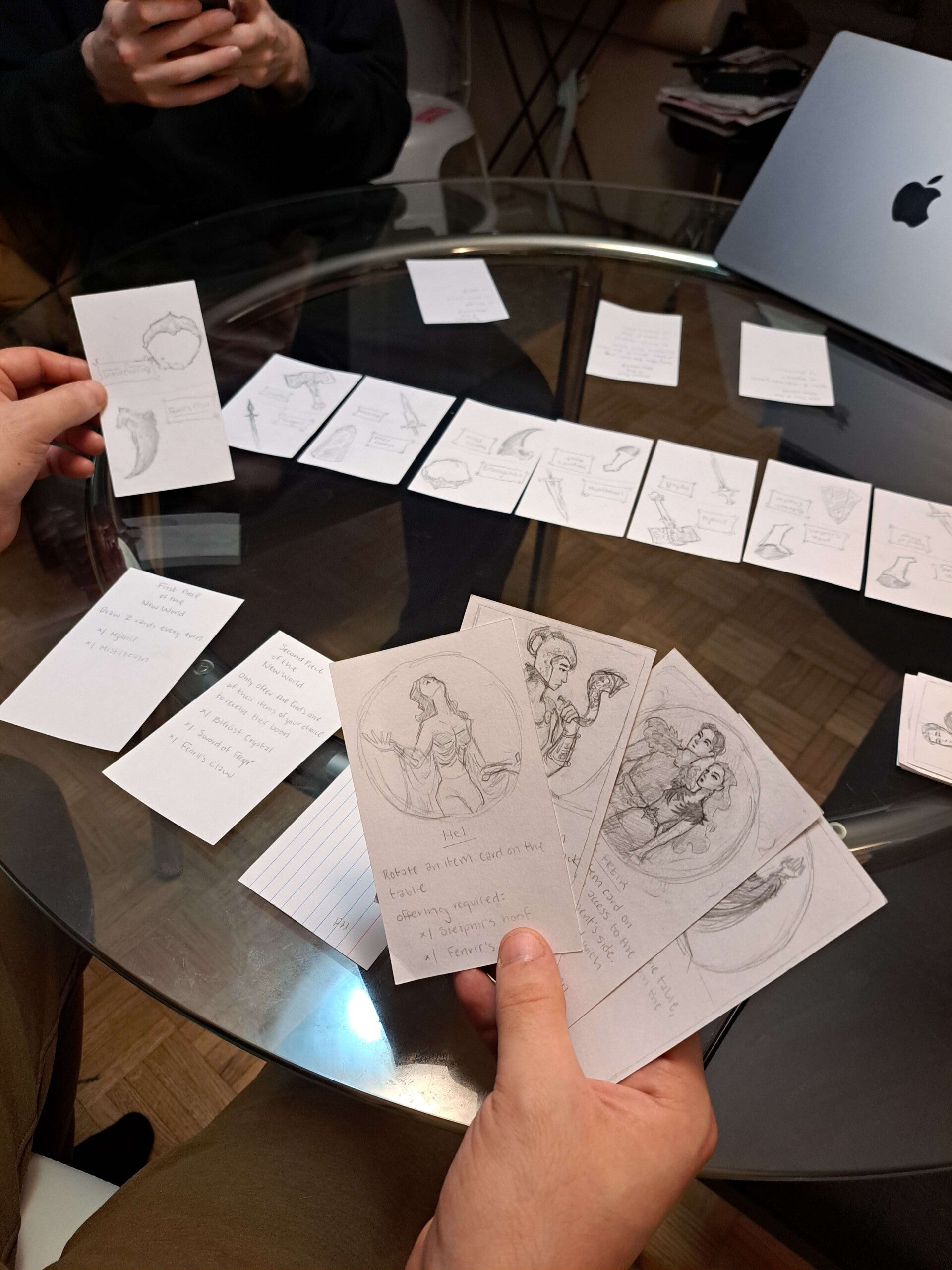 At the beginning of creating a card game, we wanted to focus on the core loop and not branch out from it; this ended up being to draw, place, and exchange. The players’ decisions would include random chance, buffs, and resource management. When introducing the game, play testers really enjoyed the resource management, as the motivation for the game is to craft pieces and offer items to the gods.